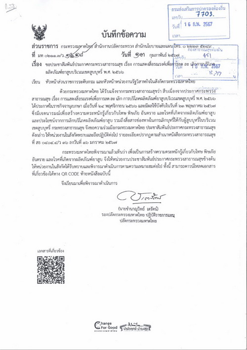 ประชาสัมพันธ์ประกาศกระทรวงสาธารณสุข เรื่อง การแสดงสื่อรณรงค์เพื่อการลด ละ เลิกการบริโภคผลิตภัณฑ์ยาสููบบริเวณเขตสูบบุหรี่ พ.ศ.2566