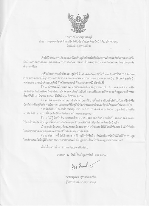 ประกาศกำหนดเขตท้องที่ทำการฉีดวัคซีนป้องกันโรคพิษสุนัขบ้าให้แก่สัตว์ควบคุม โดยไม่เสียค่าธรรมเนียม